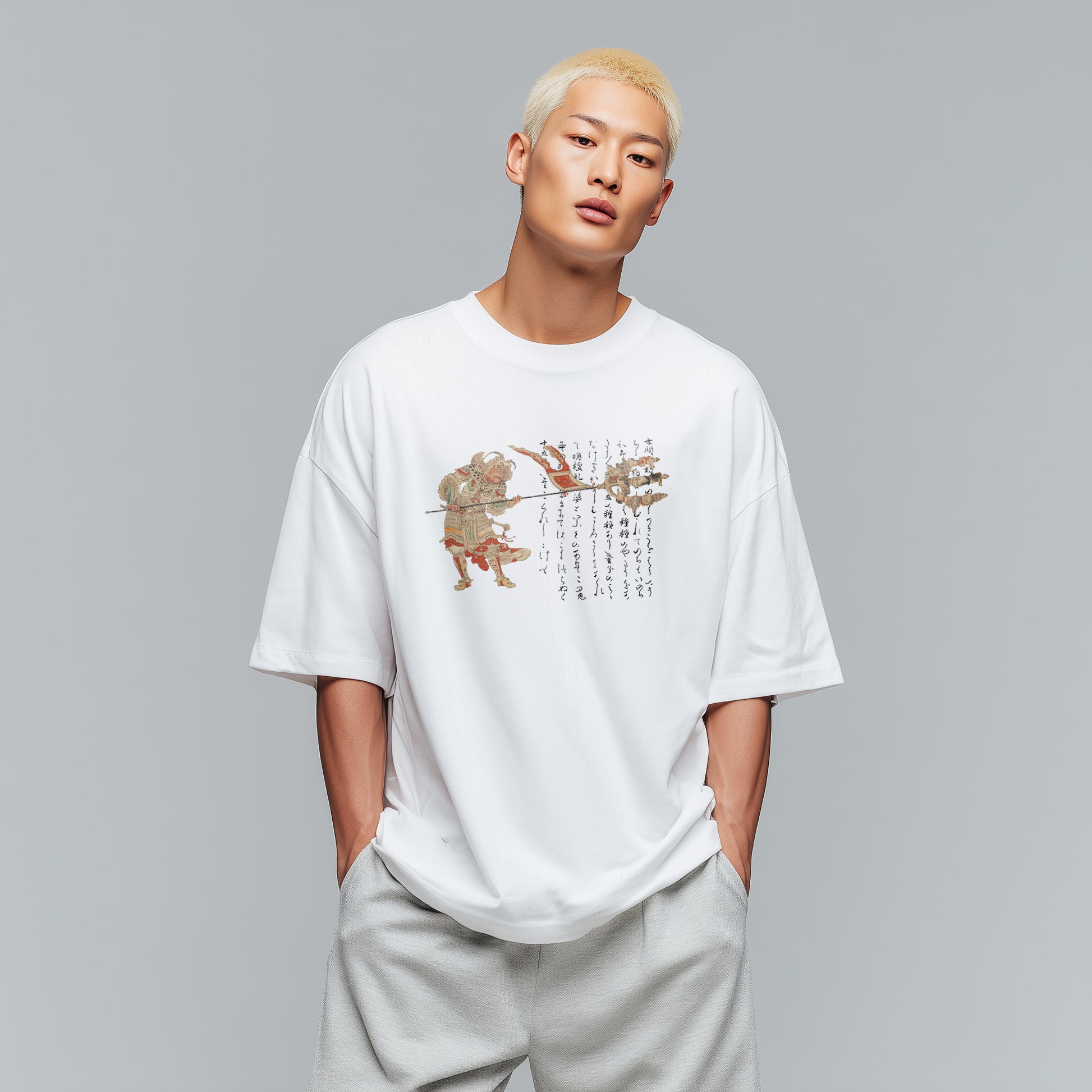 This artwork depicts Sendan Kendatsuba, who exterminates evil spirits that bring harm and illness. Originally a music deity from India, he became one of the Eight Legions serving Taishakuten. In this scene, moved by the sorrow of mothers grieving for their children, Sendan Kendatsuba beheads fifteen demons said to harm unborn babies or cause illness in infants, and impales their heads on his trident.