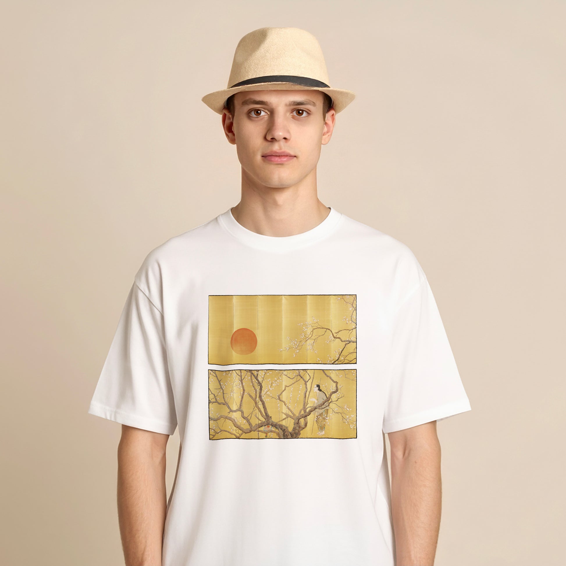 This folding screen depicts a scene from the Noh play "Yoroboshi," part of the traditional Japanese performing art known as "Noh." It portrays the blind monk worshiping the setting sun of the equinox in a garden filled with plum blossoms. The monk’s face evokes the essence of a Noh mask, reflecting Kanzan’s deep understanding of Noh theater.